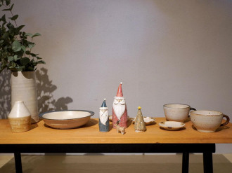 皿や丼鉢、マグカップなどの器をはじめ、花器やオブジェなど約200点を展示する。サンタクロースのオブジェ「陶サンタ」は、だるまのようにふっくらした形のものや、ひげや服の模様が異なるものなど、バリエーションを増やした。ツリーやトナカイも用意し、組み合わせて飾ることもできる。「クリスマスに向かっていく時期なので、見た時に『わーっ』と思ってもらえるようにしたかった」と古田さん。ディスプレーも工夫し、草花や木の実を飾り、壁にはリースをかけた。
