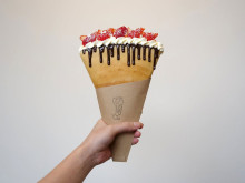 クレープは1年半かけて開発したという生地が特徴。材料の温度管理や調合の方法、生地の温度、焼き台の温度、焼き時間などを調整して「パリパリ食感」に仕上げるという。