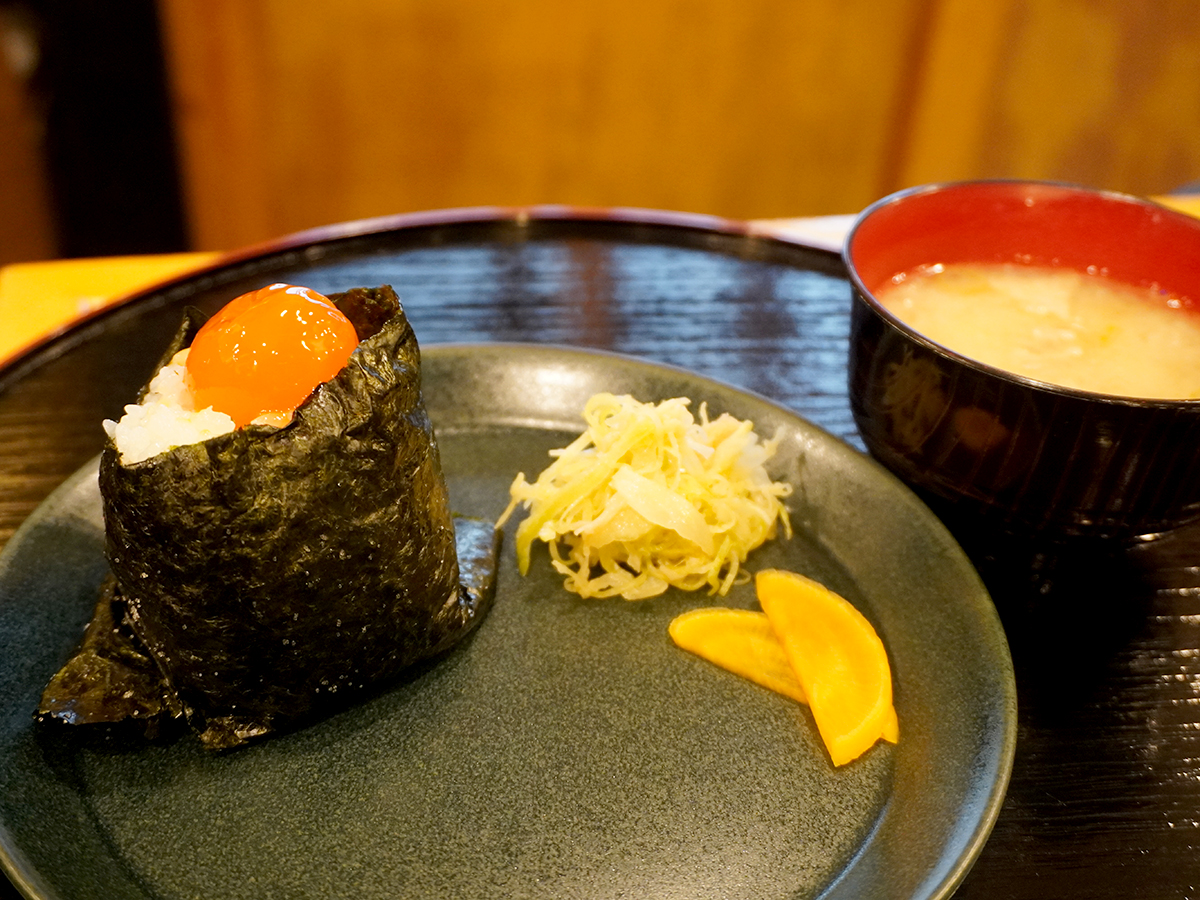 中におかかを入れ、上に卵の黄身漬けをのせた「満月むすび」