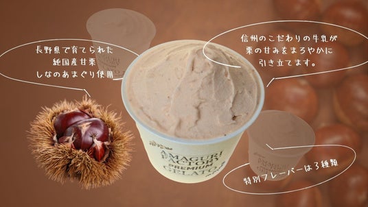 希少な「しなのあまぐり」をふんだんに使用。低温熟成によって引き出された凝縮の甘みと香ばしさを、なめらかな口どけのジェラートに閉じ込めました。