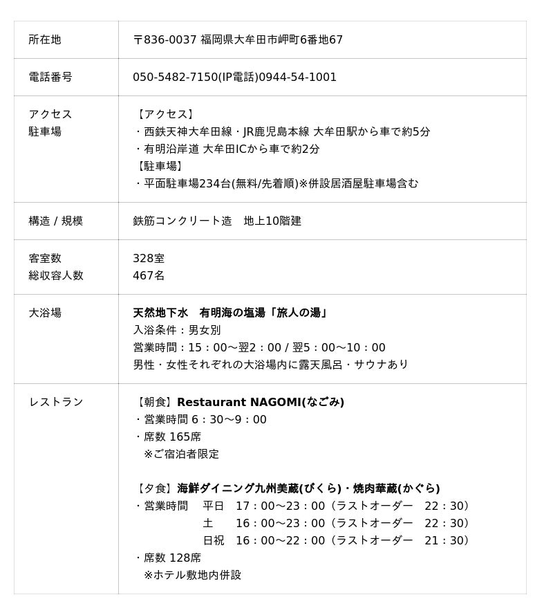 有明沿岸道・大牟田ICから車で約2分と、アクセスの良い立地です。ご宿泊のお客様には、無料のバイキング朝食をご用意し、快適で心地よいひとときをお過ごしいただけます。また、別棟の海鮮ダイニング九州美蔵・焼肉華蔵 ホテルルートイン大牟田店も同日OPENいたします。観光やビジネスの新たな拠点として、皆様のご来館を心よりお待ち申し上げております。