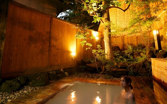 「興奮のあと、静寂に包まれる至福。」 鮮烈な花火を至近距離で浴びた後は、幻想的な露天風呂へ。乳白色の柔らかな湯が、感動で高まった心身を優しく解きほぐします。