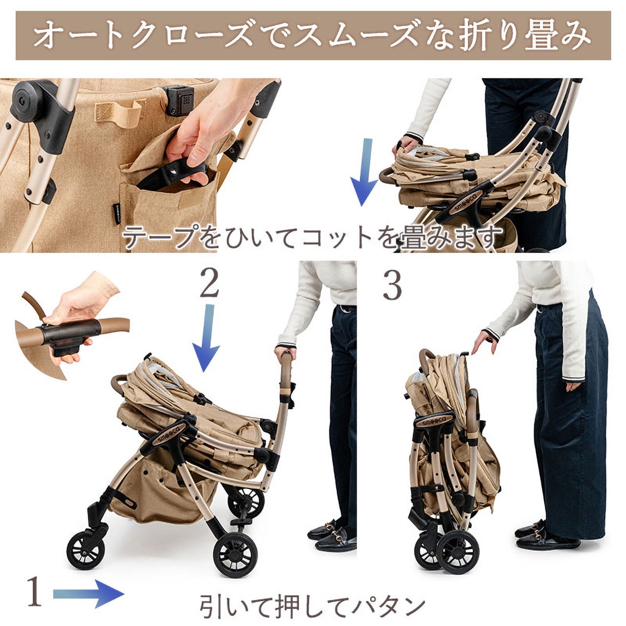従来の3WAYタイプで課題となっていた、収納時の「コットを取り外す煩わしさ」を解消。フレームにコットを装着した状態での折り畳み・収納が可能になり、外出先や玄関先での利便性が飛躍的に向上しました。