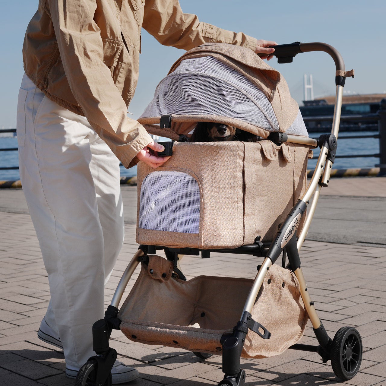 日差しや人混みなど、周囲の状況に合わせて開閉するキャノピー(幌)は、ワンタッチでスムーズに操作が可能。愛犬の様子をすぐに見守ることができ、急な天候変化や場所の移動にも即座に対応できます。