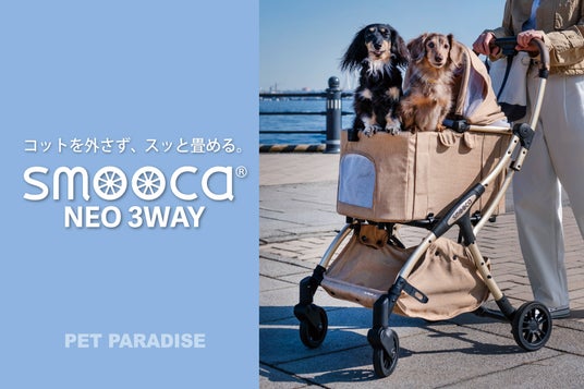 株式会社クリエイティブヨーコ(本社:長野県長野市 代表取締役社長:北原 武幸)が展開するペット用品専門ブランド『ペットパラダイス』は、ペット専用カート「スムーカ」シリーズの最新モデル『スムーカネオ 3WAY』を店舗及び公式オンラインストア、その他各ネットショップにて発売しました。