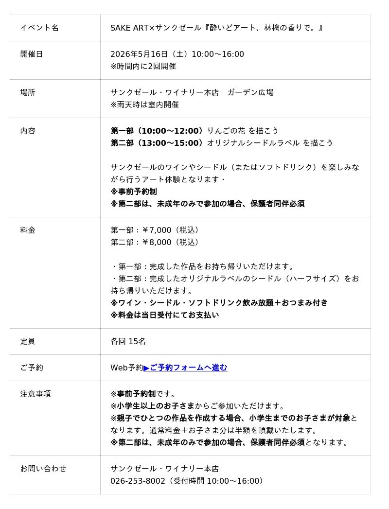 株式会社サンクゼール(本社:長野県飯綱町/代表取締役社長:久世良太)は、2026年5月16日(土)にサンクゼール・ワイナリー本店 ガーデン広場にて開催する年に一度のイベント『いいづなシードルガーデン2026』において、株式会社ARTLIER(アートリエ/代表取締役:目黒健太郎)が主催するアート体験スタジオ「SAKE ART(サケアート、以下「SAKE ART」)」との初めてのコラボレーションとなる特別ワークショップを開催いたします。