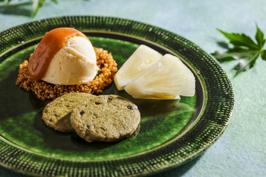 [デザート]自家製バニラアイスクリーム 味噌キャラメル 北海道産キヌアのパフ /よもぎのサブレ 季節のフルーツ