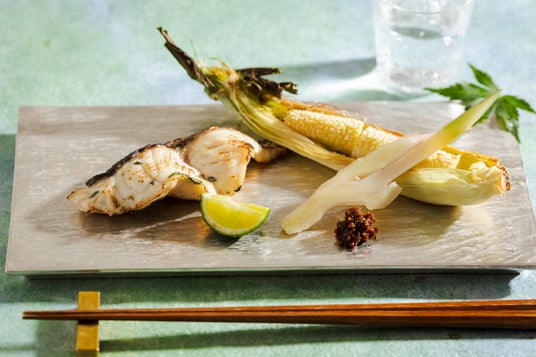 [焼き物]スズキの木の芽若狭焼き 皮つきヤングコーン 谷中生姜 酢橘