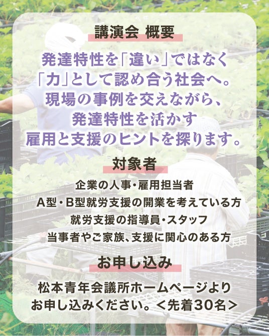 一人ひとりの持つ特性を理解し、それを力として活かせる社会づくりは、企業にとっても地域社会にとっても大きな可能性を秘めています。今回の講演が、皆さまにとって新しい視点やヒントを得られる機会となれば幸いです。