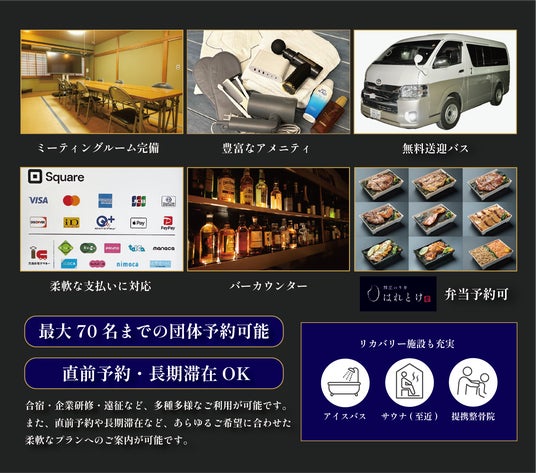 - 最大70名までの団体利用対応(直前予約も大歓迎)