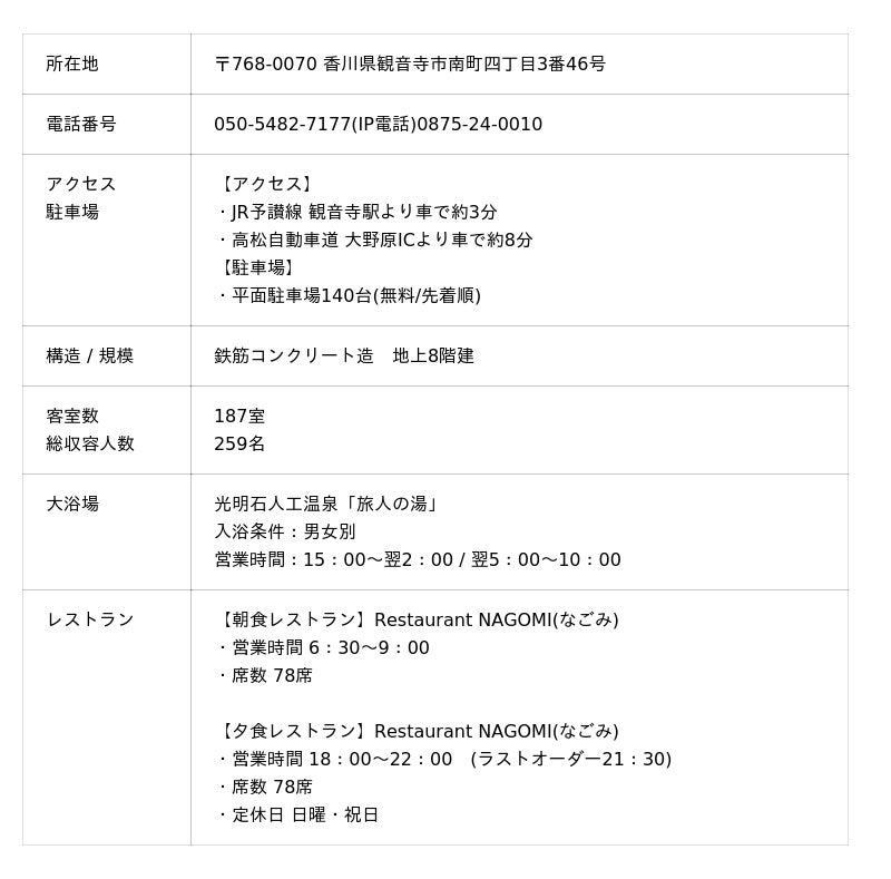 JR予讃線 観音寺駅から車で約3分、高松自動車道 大野原ICから車で約8分に位置し、無料平面駐車場140台を完備しております。フォトジェニックスポットとして有名な「銭形砂絵」、天空の鳥居「高屋神社」、そして「父母ヶ浜」へのアクセスも良好で、ビジネスや観光の拠点として最適なホテルです。自慢のバイキング朝食や光明石人工温泉を備え、快適なご滞在をサポートいたします。