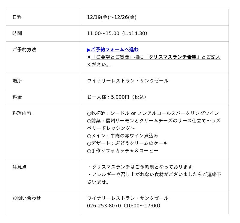 株式会社サンクゼール(本社:長野県飯綱町)が運営するサンクゼールの丘から、クリスマスのお知らせです。12月9日(火)から12月26日(金)までワイナリーレストラン・サンクゼールで「クリスマス限定ランチ」をご用意します。また、12月20日(土)・21日(日)・24日(水)・25日(木)限定で、サンクゼールオリジナル「ぶどうクリームのケーキ」と「福味鶏のコンフィ」をお持ち帰り販売します。いずれもご予約受付中。席数、ご用意数共に限りがございます。お早めにチェックしてくださいね。