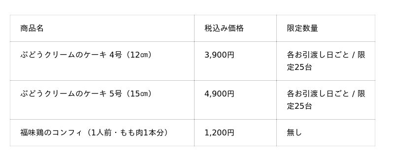 12月20日(土)・21日(日)・24日(水)・25日(木)限定で、「ぶどうクリームのケーキ」と「福味鶏のコンフィ」をお持ち帰り販売します。ご予約期間は12月16日(火)まで。家族で過ごすあたたかなホームパーティーにサンクゼールのケーキとチキンはいかがでしょうか。