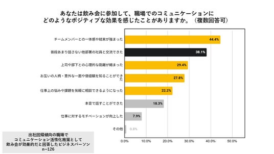 飲み会のポジティブな効果として「チームメンバーとの一体感や結束が強まった(44.4%)」「普段あまり話さない他部署の社員と交流できた(38.1%)」「上司や部下との心理的な距離が縮まった(22.2%)」が上位に挙がりました。 また、「飲み会がきっかけで仕事が円滑に進んだエピソード」として、「フランクな雰囲気で上司と会話でき、仕事でも気軽に相談出来るようになった。」「人となりが分かるようになったので、仕事が進めやすくなった。」といった、飲み会の気軽な雰囲気の中での相互理解が進んだという声が多数寄せられました。