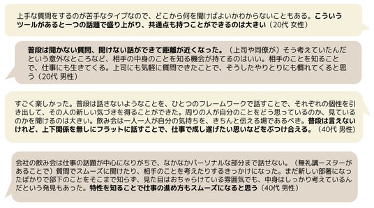 「年上よりも年下のほうが仲良くなりやすい。」「ワイワイ盛りあがるより、しっぽり語るほうが好きだ。」など、価値観を問う40個のトークテーマを厳選。会話の主体となる親を順番で回すため、公平に会話に参加でき、上下に関係のない「心理的安全性」が保たれた空間をつくります。質問によって自己開示を促しながら、自然にお互いの価値観や意外な一面を引き出す会話が生まれます。