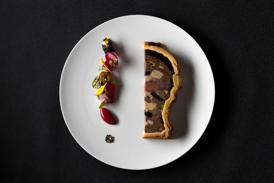 鹿や猪、山鳩など4種以上のジビエにトリュフやフォアグラを幾層にも重ね、パイで包み焼き上げた前菜パテ・ド・ロワ。ジビエの種類や部位ごとにミンチやモルソー(塊)など調理法を変え、食感と旨味のグラデーションを作り出します。王冠を象った特製の金型で焼き上げたパイは、ゲストの前で切り分けられます。幾何学的に重なり合う断面はまさに芸術的です。酸味のあるグロゼイユのソースや甘みを感じる紅芯大根などを添え、ジビエの味わいや食感に変化と新鮮さを加えます。