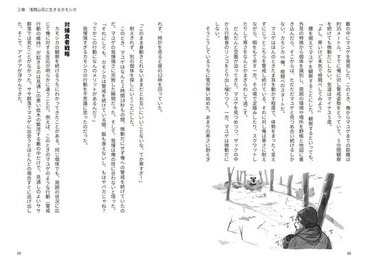 大学で野生動物研究室に所属した著者は、野生動物との出会いや恩師、フィールドワークの達人たちとの交流を通じて研究にのめり込みます。単独の観察からチームでの研究へと視点が広がっていく過程は、カモシカたちの変化とも重なり、本書の大きな魅力となっています。