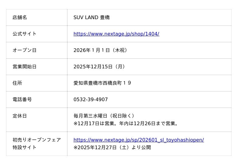 ・SUV LAND 豊橋:https://www.nextage.jp/sp/202601_sl_toyohashiopen/