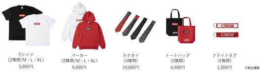 パーカー(2種類)、ネクタイ(4種類)、トートバッグ(2種類)、フライトタグ(2種類)の計12アイテムが