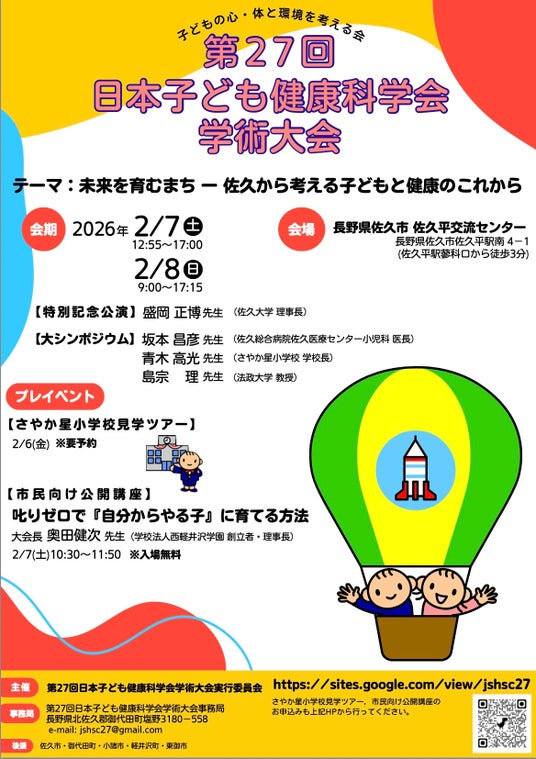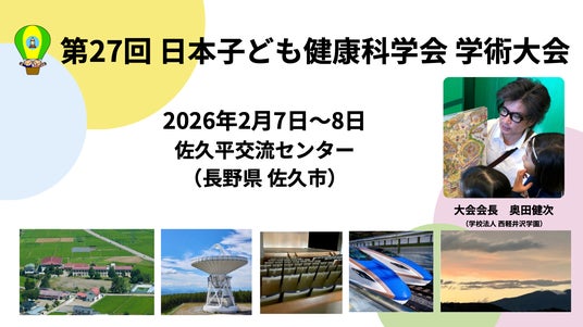 第27回日本子ども健康科学会学術大会実行委員会は、長野県佐久市の「佐久平交流センター」にて、医療・教育・心理・福祉の専門家が領域を超えて議論する「第27回日本子ども健康科学会学術大会」を、2月7日(土)・8日(日)の2日間にわたり開催いたします。