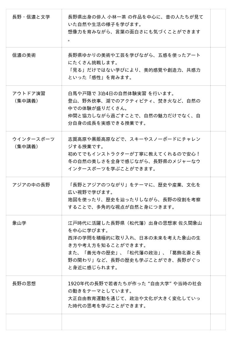 など、興味に合わせて選べるのもうれしいポイント。長野で過ごす学生生活をもっと豊かにしてくれるのが、この「長野学」です。