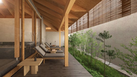 ・信州の自然を五感で味わう外気浴:信州の心地よい風をダイレクトに感じられるよう、設計の段階から空気の流れを緻密に計算しました。シラカバやシラカシ、ソヨゴなど長野の原風景を思わせる瑞々しい木々や、アサギリソウ、ギボウシが彩る景色は、まさに日常の喧騒を忘れさせる空間へと仕立て上げました。