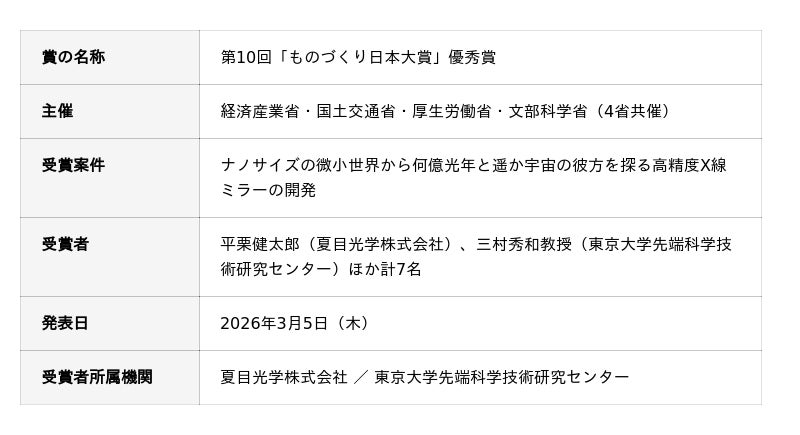 夏目光学株式会社(長野県飯田市、代表取締役社長:細江国彦)の平栗健太郎と、東京大学先端科学技術研究センターの三村秀和教授をはじめとする研究グループ計7名が、経済産業省・国土交通省・厚生労働省・文部科学省の4省が共催する第10回「ものづくり日本大賞」において優秀賞を受賞しました。受賞案件は「ナノサイズの微小世界から何億光年と遥か宇宙の彼方を探る高精度X線ミラーの開発」。2012年から続く産学連携を通じて確立した国内唯一の精密転写技術が、高く評価されました。