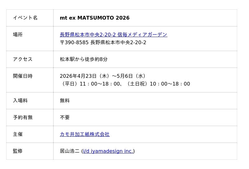文具・雑貨向けマスキングテープ”mt masking tape”を製造するカモ井加工紙株式会社(本社:岡山県倉敷市)は、長野県松本市「信毎メディアガーデン」にて、長野県内初の「mt ex展」を開催します。