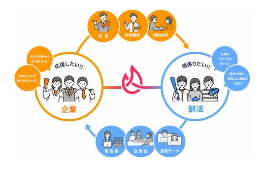 当社は、企業が大学の部活に対して、小口でスポンサー出資ができるサービス「SPONSORS BOOST」を展開しています。 「SPONSORS BOOST」は、企業が応援したい部活に対して小口支援することで、企業が部活の学生と早期接点が持つことが出来、採用にも活用できるサービスです。部活動支援を通じて企業ブランディングと学生接点を創出する新しい採用モデルとして、全国で導入が進んでいます。