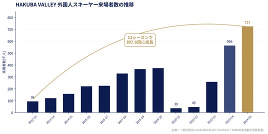 白馬エリアの10スキー場で構成される「HAKUBA VALLEY」では、2024-2025年シーズンの外国人スキーヤー来場者数が約72.7万人(前年比128%)となり、統計開始以降の過去最高を更新。同エリアの外国人来場者数は2012-13シーズン以降、年平均18%の伸び率で推移しています