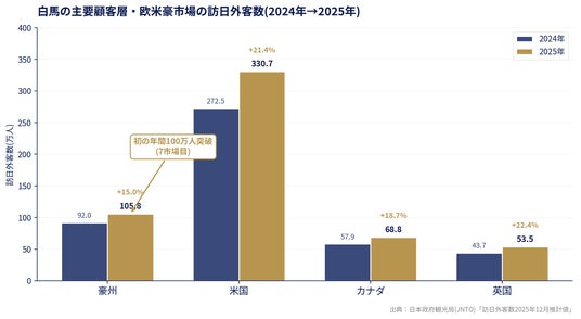 中でも、白馬エリアが顧客層として想定する欧米豪市場の伸長が顕著です。豪州は2025年の年間訪日外客数が初めて100万人を突破し(約105.8万人、前年比+15.0%)、米国(約330.7万人、前年比+21.4%)、カナダ(約68.8万人、前年比+18.7%)も大幅に伸びています