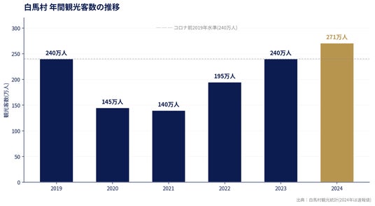 対象物件が立地する長野県白馬村は、1998年冬季オリンピックの開催地としても知られる山岳リゾートエリアです。白馬村役場の観光統計によると、2024年の年間観光客数は約271万人(速報値)と、コロナ禍前の2019年(約240万人)を上回り、過去20年で最高水準を記録しました。