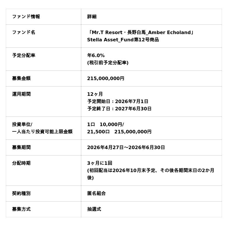 Stella Asset株式会社(本社:大阪府大阪市、代表取締役:谷中 譲)は、ホテル・旅館・リゾート特化型の不動産クラウドファンディング「StellaVia(ステラヴィア)」において、新規ファンド「『Mr.T Resort・長野白馬_Amber Echoland』Stella Asset_Fund第12号商品」を、2026年4月27日より募集開始いたします。
